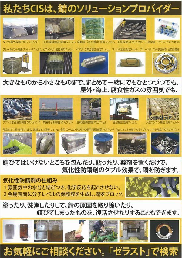 金属製品を取り扱うお客様の永遠の悩みである「錆の発生」について気化性防錆剤のトップブランド「ZERUST・EXCOR」の日本での供給を担う、大洋シーアイエス株式会社様とタイアップして静岡県西部を中心に防錆についての提案しております。